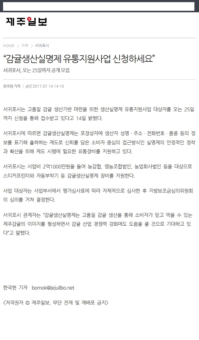 "감귤생산길명제 유통지원사업 신청하세요"