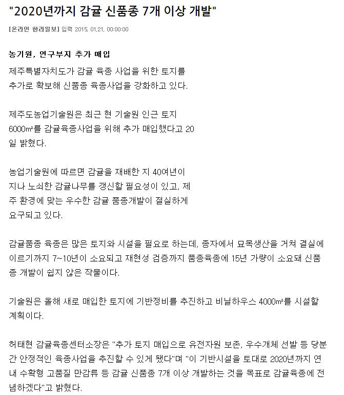 "2020년까지 감귤 신품종 7개 이상 개발"