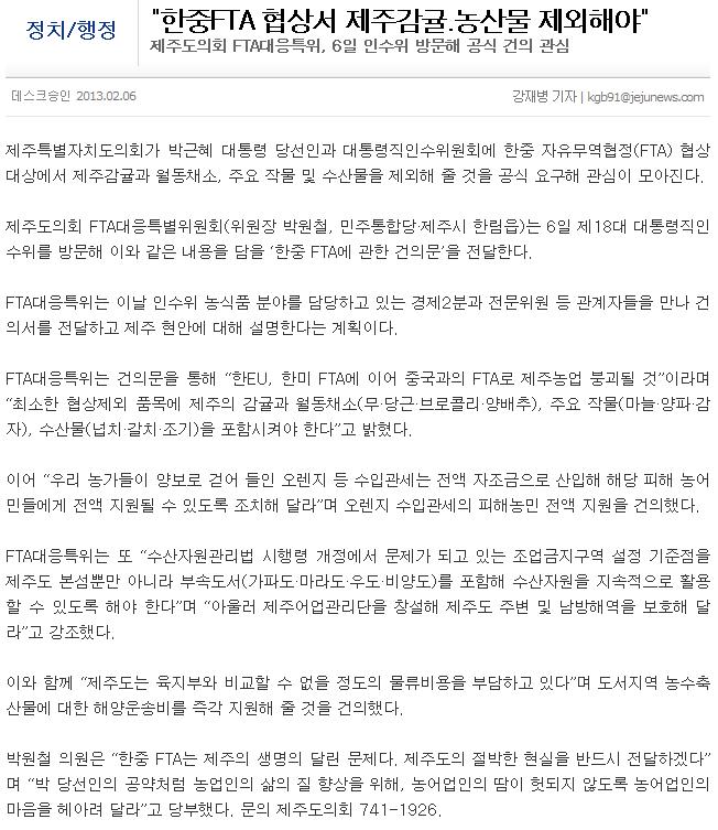 "한중FTA 협상서 제주감귤.농산물 제외돼야"