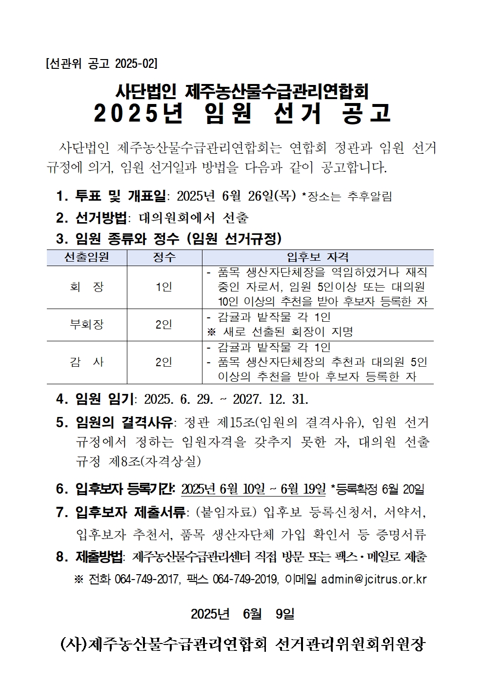 [카드뉴스] (사)제주농산물수급관리연합회 2025년 임원 선거 공고